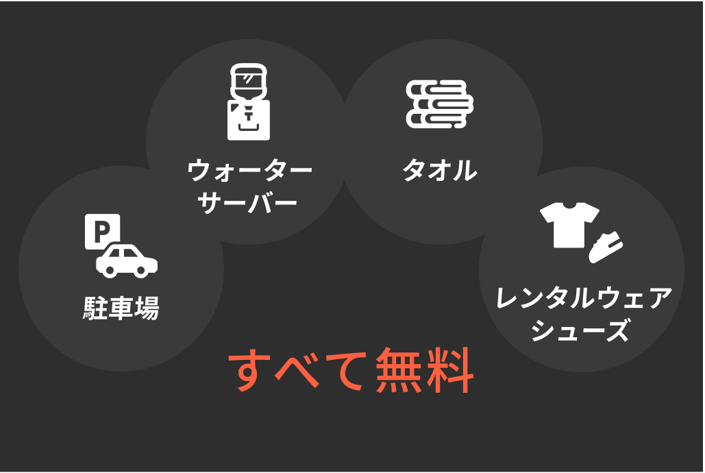 当店はレンタルウェアタオル・シューズ・飲料水が無料になります。手ぶらでご来店いただいても大丈夫です。
