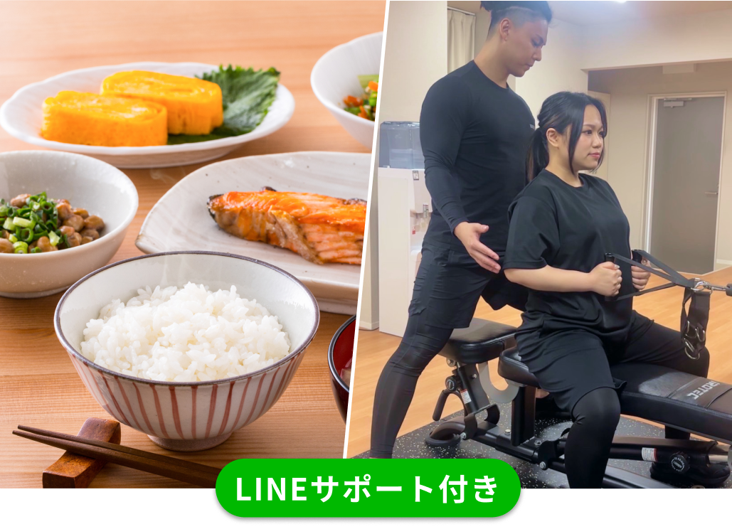 体力レベルに応じてトレーニング強度を徐々に調整していきます。食事はジムにいない時でもLINEでのサポートが可能です。